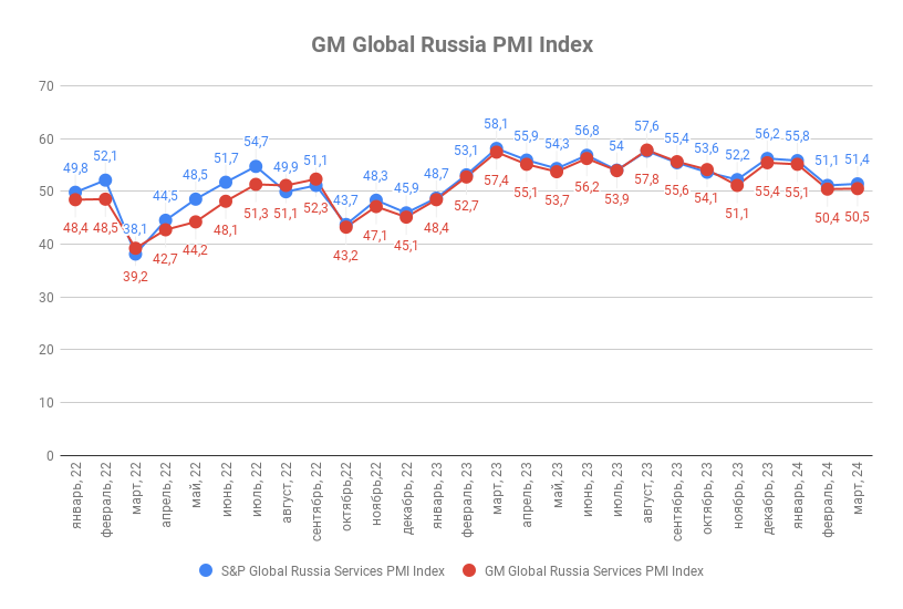 Мартовское значение индекса деловой активности ГлобалМедиа PMI (GM Global Services Russia PMI Index) составило 50,5 п.п. против 50,4 п.п. в феврале. Значение индекса деловой активности в сфере услуг от S&P Global (Global Russia Services PMI by the S&P Global) за аналогичный период выросло с 51,1 п.п. до 51,4 п.п.