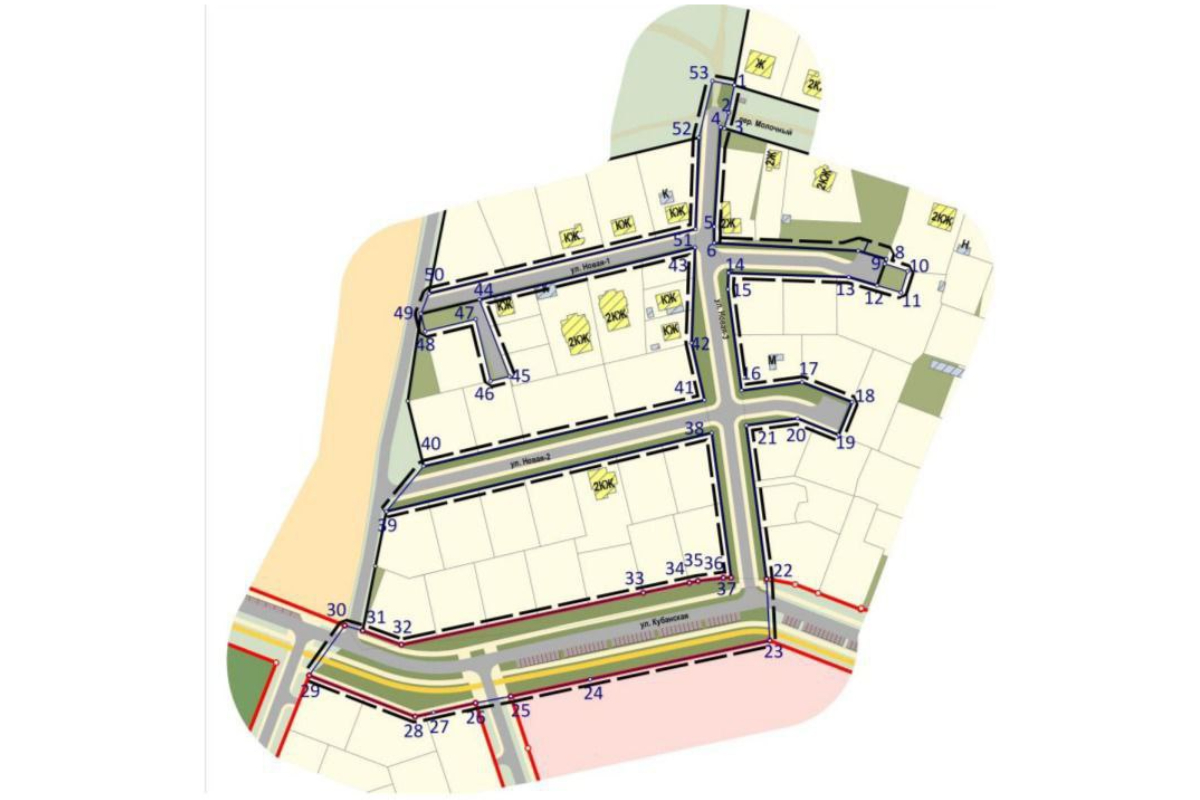 Согласно документации проекта, для объекта выделена площадь 2,4 га. Проектом предусмотрено четыре улицы: Новая 1, Новая 2, Новая 3 и Кубанская, каждая длинной от 243,5 до 281,1 метр. Ширина проезжей части составит 6-7 метров. Также обустроят тротуары и велосипедные дорожки по 3 метра.