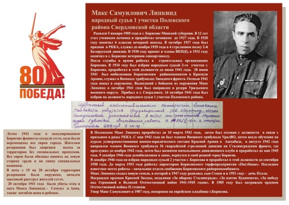 Липкинд Макс Самуилович - народный судья 1 участка Полевского района Свердловской области, гвардии капитан.