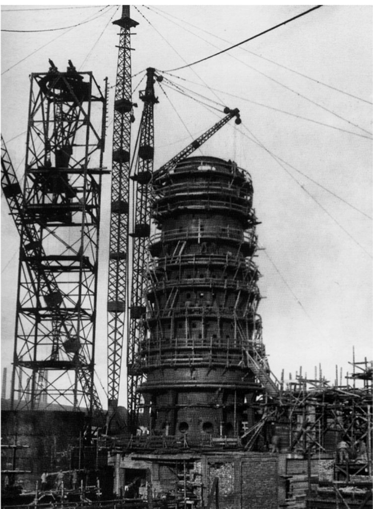 «С бункерной эстакады открывается чудесный вид на строительство. Прямо высится шахта печи. Она уже приобрела свою законченную форму. Ее темный силуэт рельефно выделяется на фоне чистого морозного неба. Левее монтируется три гигантских цилиндра. Это кауперные аппараты. Один из них уже готов. В нем началась огнеупорная кладка. Слышится дробь пневматических молотков. Клепальщики, примостившись на узеньких мостиках, загоняют раскаленные заклепки в металлическое тело каупера. Немного поодаль, на головокружительной высоте вспыхивают ослепительные голубовато-белые огни. Стахановцы-электросварщики заваривают конструкции газоочистки», – рассказывал в местной многотиражке тов. Юрьев.