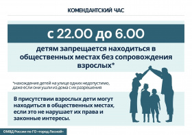 Детям, не достигшим возраста 16 лет, не допускается пребывание на улицах и в общественных местах в ночное время (с 22.00 до 6.00) без сопровождения родителей.