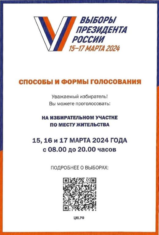 Предлагаем вам ознакомиться с информацией о способах и формах голосования на выборах Президента Российской Федерации 15-17 марта 2024 года.