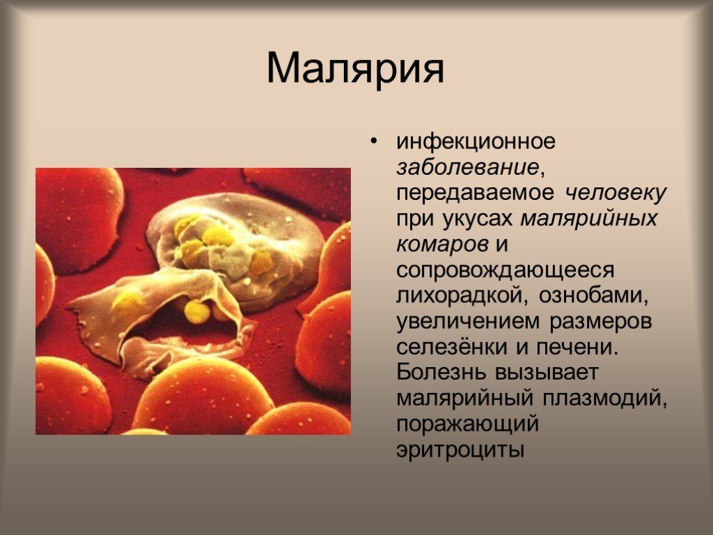 Маляри́я группа трансмиссивных инфекционных заболеваний, передаваемых человеку при укусах самками комаров рода Anopheles («малярийных комаров»)..
