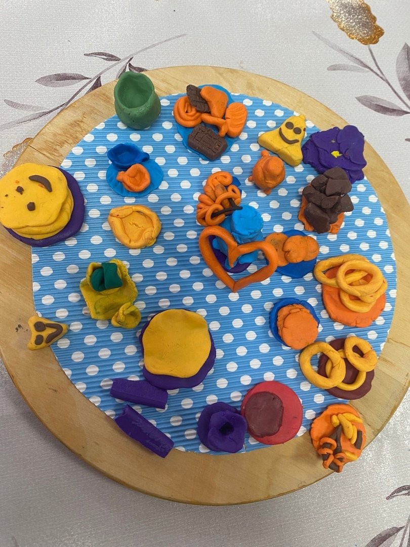 Далее ребята лепили посуду, угощения из пластилина создавая атмосферу праздника «Масленицы»: самовар, кувшин, чайные чашечки, тарелки, блюдца, баранки, печенья, блины, пряники, шоколад, конфеты (в миниатюре).